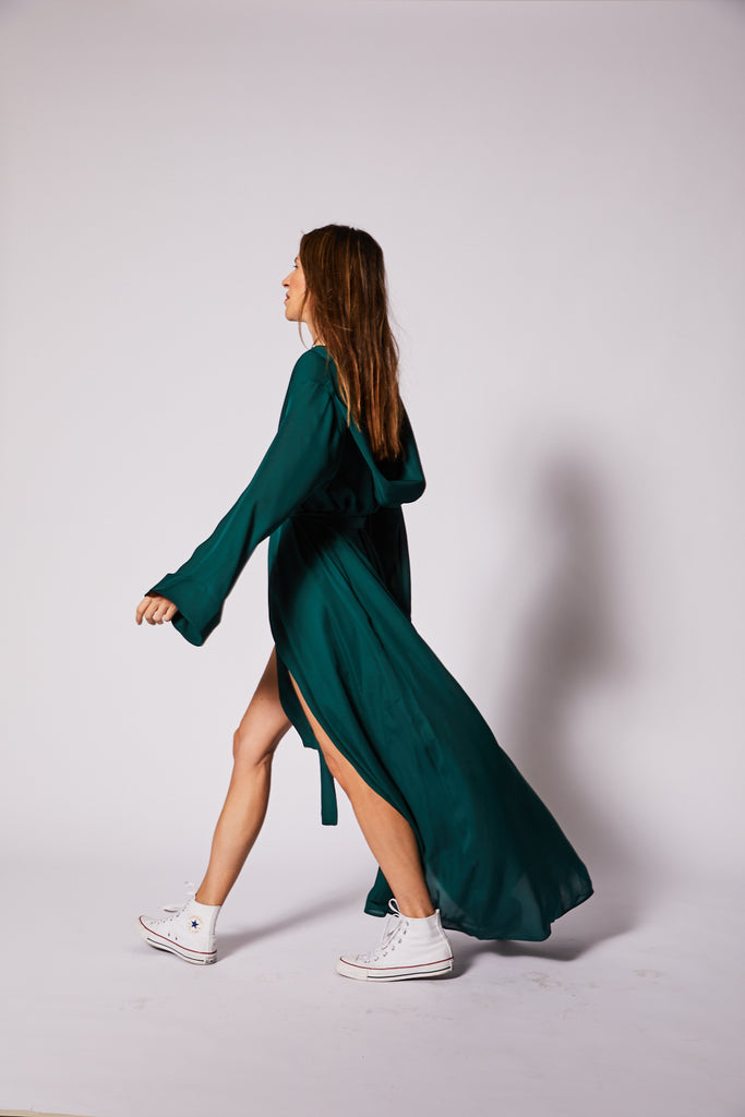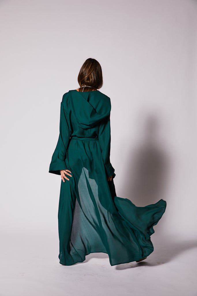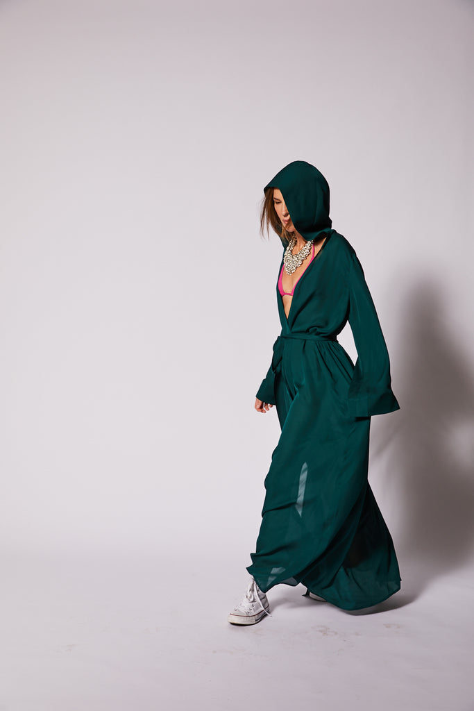 Pockets, hood, sash, buttons to adjust size, one size fits all, kimono sleeves, full skirt, day to night resort, luxury travel essentials