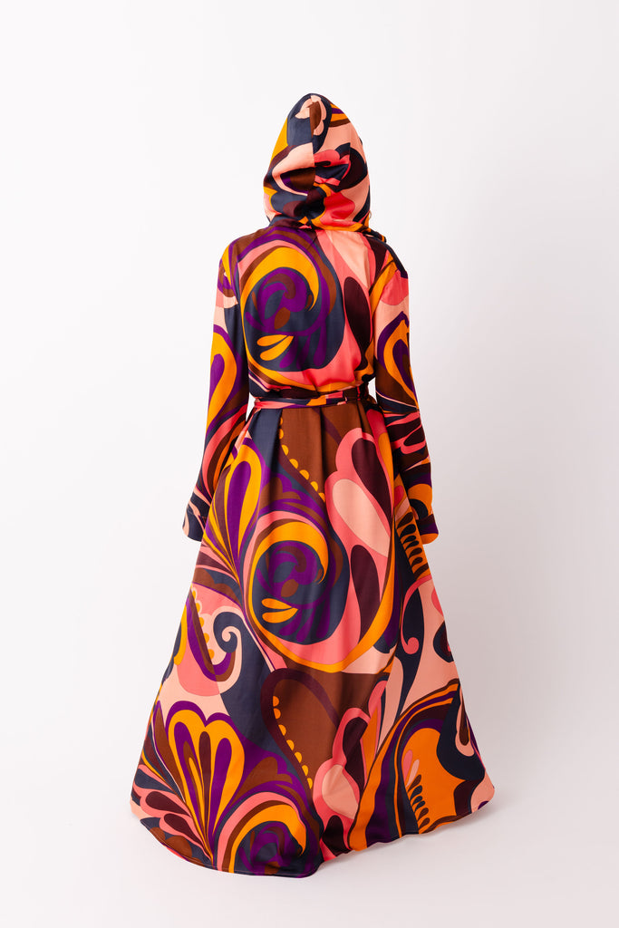 Featuring kimono sleeves, a graceful hood, adjustable hidden buttons, side pockets, and separate sash for styling versatility. Effortlessly transitions from daytime adventures to elegant evenings.