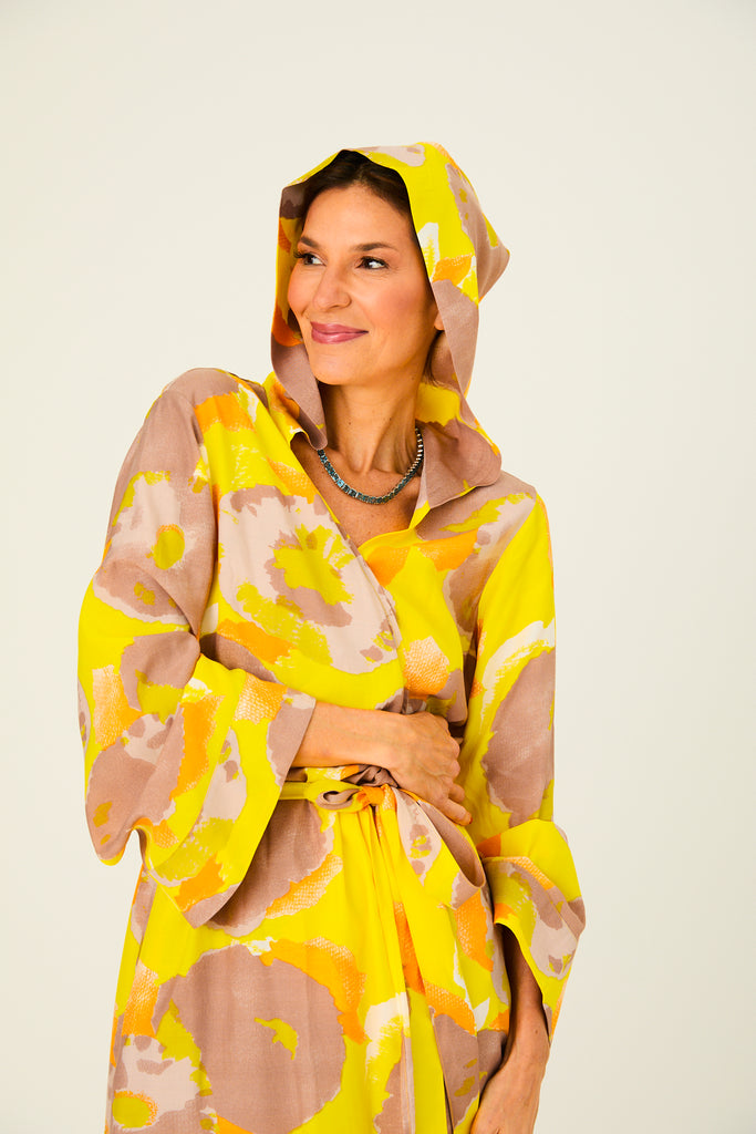 The Mid-weight Partou made from 100% woven viscose with a softly structured drape. Designed with kimono sleeves, a graceful hood, side pockets, hidden adjustable buttons, and separate sash to tailor your perfect fit. Ideal as stylish resort wear or a versatile day-to-evening travel piece.