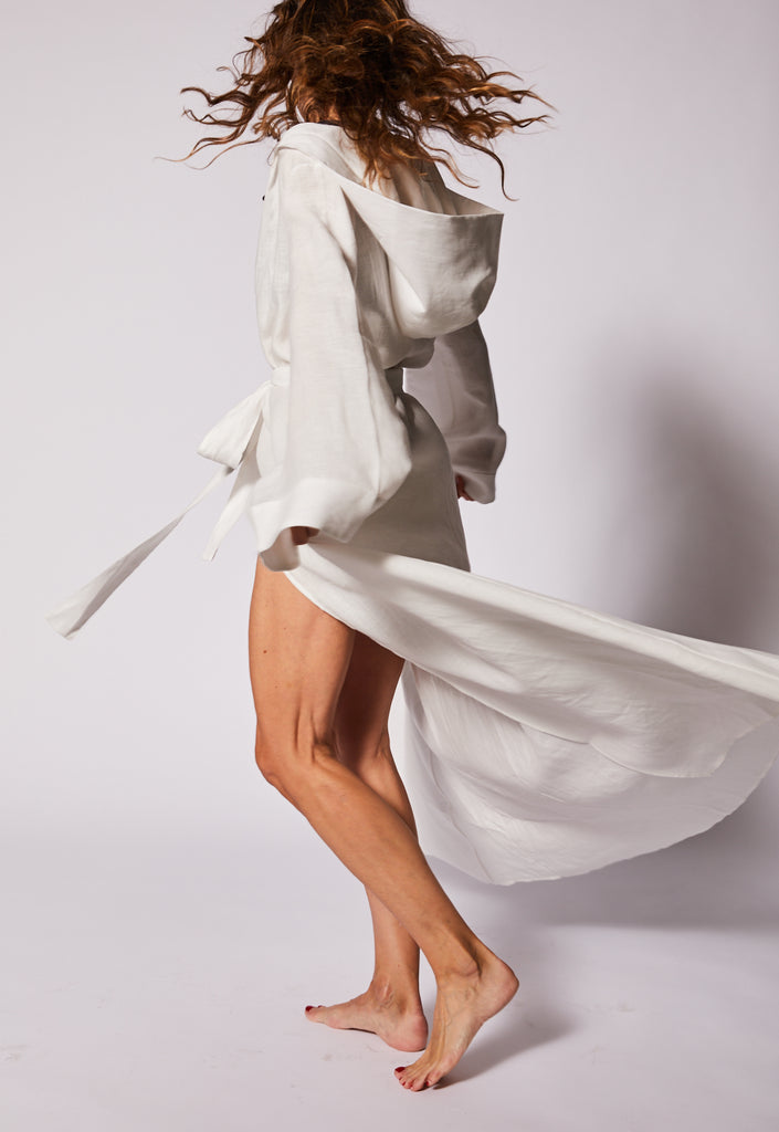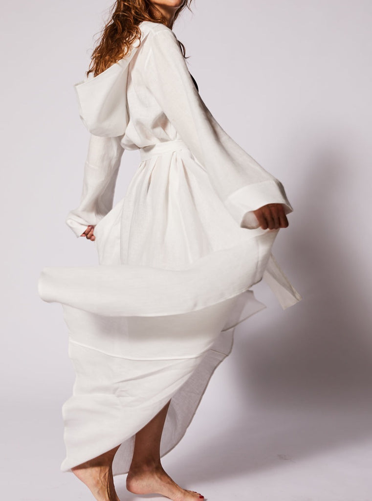 Elegant kimono-inspired luxury Partou designed by Partou Soleil, blending comfort with sophistication. Features a draped hood, long graceful lines, and versatility perfect for luxury resort wear, effortlessly transitioning from day to evening occasions.